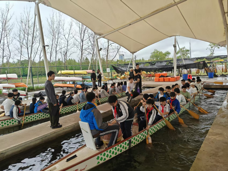 下午,海大龙舟社的志愿者带领同学们前往龙舟码头进行龙舟体验。志愿者首先简单给学生们介绍了龙舟文化,以及划龙舟的动作要领和注意事项。随后大家分组体验龙舟训练,龙舟体验并非易事,同学们汗水浸湿了衣衫,手臂因长时间划桨而酸痛不已。但正是这些挑战,让同学们学会了坚持与毅力。每当想要放弃时,看看身旁的队友们,他们同样汗流浃背却依然咬紧牙关坚持着,这份齐心协力、团结合作的精神力量感染大家,让大家有了继续前进的动力。最终,当大家完成训练任务,那份成就感与自豪感是任何言语都无法形容的。